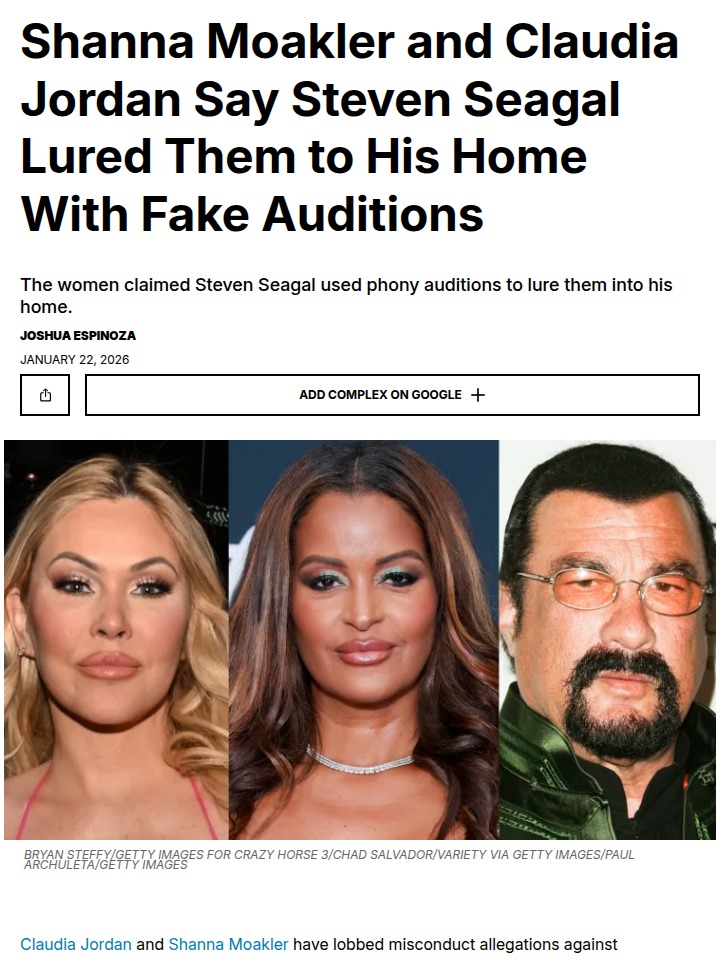 julie72+FollowSteven Seagal Audition Scandal Exposed 😳Claudia Jordan and Shanna Moakler just dropped bombshells on their new podcast, claiming Steven Seagal lured them to his house with fake auditions! Both say he tried to get them alone under the guise of reading for a part, but things got super sketchy—locked doors, unwanted massages, and zero real roles. Fans are debating: is this the final straw for Seagal’s reputation, or will Hollywood keep looking the other way? #Entertainment #Celebrity #StevenSeagal248Share
