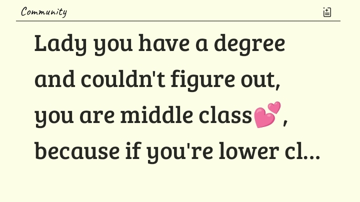 Lady you have a degree and couldn't figure out, you are middle class💕, because if you're lower class like most of you know that you straight for beans, flour, rice, sugar, sunnyD, bag of corn flakes or toasted O's, hot dogs, ham or bologna, buns, tea, coffee, eggs, bread cheapest wheat, tortillas ,cheapest margarine, pancake mix syrup light, milk 2%x2, as much hamburger you get with what's left. at Walmart that might be a half pound 😆 Us poor folk know where meat is cheaper, eggs and produce , and other items, and what's on sell, and how closely they are located together And from us, and in some cases on the same bus line. So we comparison shop and then go to each store, not usually more than 3 to save on average around $7-$11 at each store! Maybe not much to you, but to us an extra $20 could actually feed my family of 4 for an entire week if it had too. How? $5 bag of pinto beans, $3 bag of flour, $3 bag powdered milk, $2.50 bag of rice, 1loat of bread $.99, bologna $1.50, tortillas $2, sunny D $. Not the healthiest, but it could do, or a sack of potatoes, bunch of spaghetti bulk sauce , big cheap margarine, oatmeal, powdered milk, and sunny D, or just beans with carrots, onions, celery, any cheap meats, and tortillas and cheap breads morning noon and night and rice maybe some oatmeal the morning and Sunny D. Poor people know how to survive, know how sho wisely, know how make money last, too say you're one of us after that was an insult. You didn't even Try!