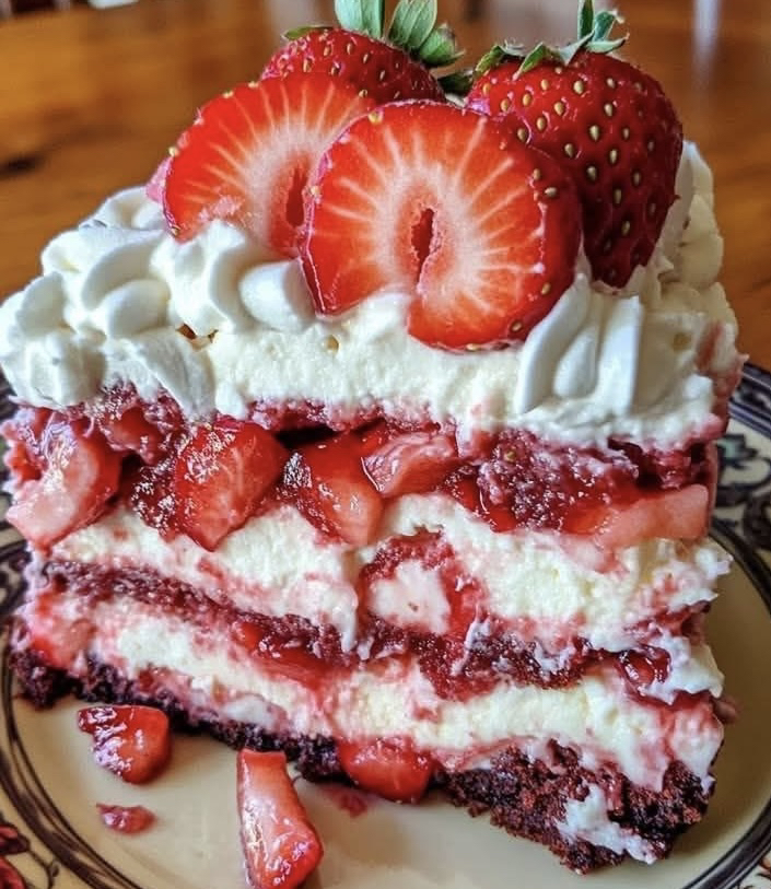 Strawberry Earthquake Cake Ingredients Cake Base: • 1 box strawberry cake mix • Ingredients listed on the box (usually eggs, oil, water) Add-ins: • 1½ cups fresh or frozen strawberries, chopped • 1 cup white chocolate chips or chunks • 1 cup sweetened shredded coconut • ½ cup chopped pecans or walnuts (optional) Cream Cheese Swirl: • 8 oz cream cheese, softened • ½ cup unsalted butter, softened • 2½ cups powdered sugar • 1 tsp vanilla extract How to Make Preheat oven to 350°F (175°C). Grease a 9x13-inch baking dish. Prepare the cake mix according to box instructions. Pour into the baking dish. Sprinkle chopped strawberries, white chocolate chips, coconut, and nuts (if using) evenly over the cake batter. In a medium bowl, beat together cream cheese, butter, powdered sugar, and vanilla until smooth. Drop spoonfuls of the cream cheese mixture over the top of the cake batter and gently swirl with a knife. Bake for 45–50 minutes, or until the cake is set and golden on top. The center will be slightly gooey—that’s the earthquake magic! Let cool slightly before serving, and enjoy warm or chilled.