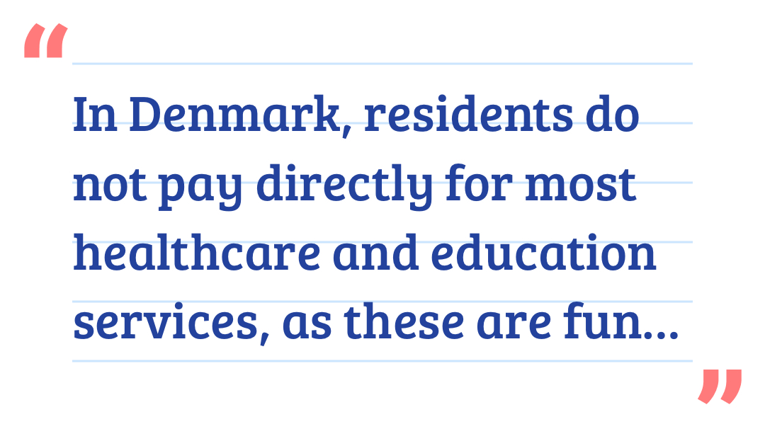 Rick wmt+FollowIn Denmark, residents do not pay directly for most healthcare and education services, as these are funded through high, progressive income taxes and public funds. While "free" at the point of service, these services are financed by a tax system that often exceeds 38% for individuals. 8134Share