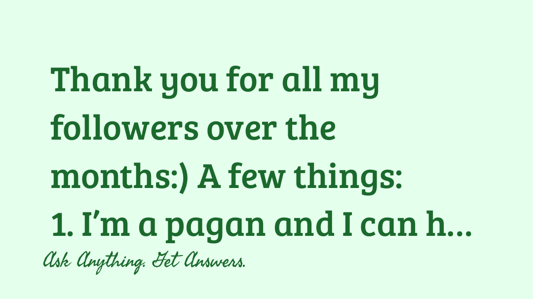 Your Local Priestess Of Artemis+FollowThank you for all my followers over the months:) A few things: 1. I’m a pagan and I can have equal appreciation for all cultures/religions/beliefs 2. I don’t sugar coat things. If you are being a doorknob dumb dumb I’m gunna say it. 3. I am an adult with adult opinions but I know the younger crowd. 4. I’m not going to hell so stop trying to convert me and clutching your pearls. 5. I believe in being a well rounded person. Get your news from many perspectives and outlets. Don’t be narrow minded on the real world or you could miss out on something important. 6. I’m a woman deal with it I don’t cower to men or their opinions Happy Yule/Holidays!!! - Your Local Badass Pagan Lady 30Share
