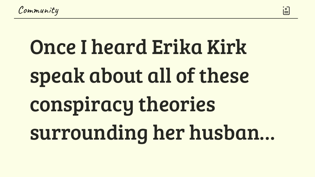 Rena +FollowOnce I heard Erika Kirk speak about all of these conspiracy theories surrounding her husband’s assassination I have realized that Charlie’s security didn’t do anything wrong. If anyone knows the truth surrounding this tragedy it’s Charlie’s Wife. I will no longer believe anything these media outlets say. They have lost any bit of credibility they had left. I’m a bold enough person with integrity to say when I’m wrong, and I will correct myself just as fast as I correct someone else. I’m very much a God loving, God fearing woman of faith. I believe if we cannot criticize ourselves, we will never be accepted of constructive criticism. I miss Charlie, and continue to pray for Erika Kirk and their children. The media and others have turned this into a mess. That makes me sad that we have so many people in the world that don’t have the guts to do the right things. Life is beautiful, and extremely short it’s time people grow up stop the nonsense. 13Share