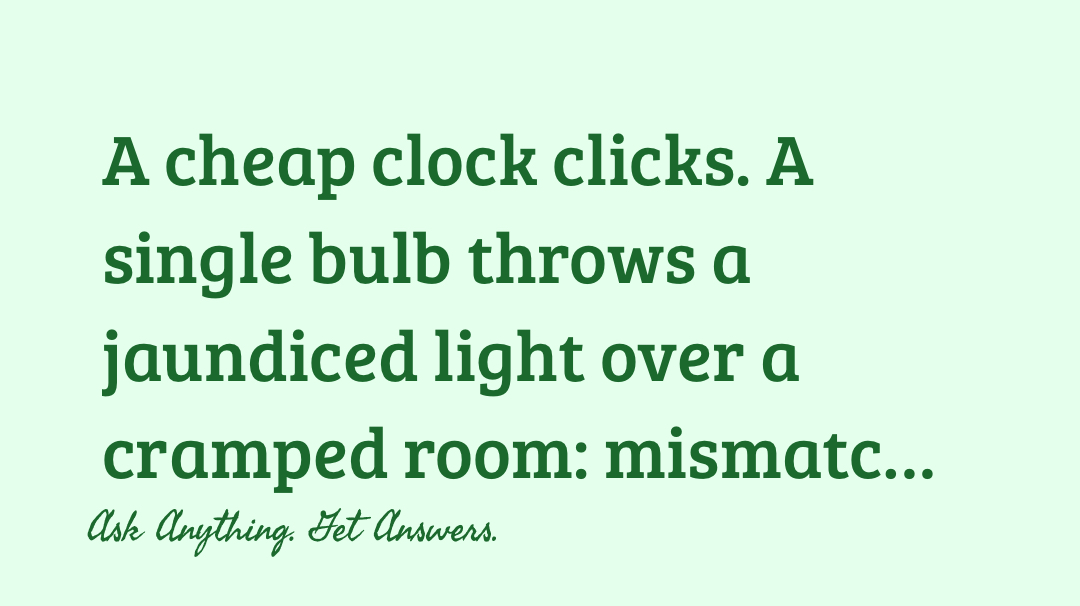 A cheap clock clicks. A single bulb throws a jaundiced light over a cramped room: mismatched furniture, stacks of unpaid bills, a small kitchen with jars of utensils. On the fridge, a faded black-and-white PHOTO of a woman in her thirties—MARIE—pinned with a crooked magnet. STEVE MARR, late seventies, bandages still wrapped around his head, sits on the edge of a sagging armchair. His hands tremble. He stares at a shoebox on the coffee table as if the box holds the answer. He peels the first strip of gauze. The adhesive protests. He grunts. The strip comes away with a small rip. STEVE (rough, surprised) Jesus... He peels the rest in quick, angry motions. Gauze falls like confetti. The light hits his face. He flinches and then studies himself. He crosses to an old mirror propped against the wall. The face that looks back is younger than it should be, cheekbones rearranged, a softened jaw. And impossibly, the tilt of the eyes, the little scar near the lip—it's Marie. STEVE No. No, no, no. He slaps the glass, not hard, more to steady himself. The echo gives him courage. He leans close, fingers tracing a contour that used to feel like his own. STEVE (under his breath) You wanted fresh, Steve. Not—this. He moves to the fridge, fingers hover over Marie's photo. He takes it down, holds it beside his face. The resemblance is undeniable. STEVE (laughing, then bitter) You look like her. You look like her because someone wants you to look like her. He opens the shoebox. Inside: discharge papers, a faded matchbook for a motel, a single glove, a stapled invoice from "PEREGRINE CLINIC — FACIAL SUTURE/RECONSTRUCTION." He snaps the invoice open. His eyes skim the print, slowing. STEVE (reading aloud) "Procedure complete. Recommended follow-up in two weeks. Consent received." He pins the paper down with a shaking hand. He flips the invoice—someone scrawled a name: "M. Harris." Not his. STEVE Who signs for me? Who— He slams the shoebox shut. He paces, slow, like an old