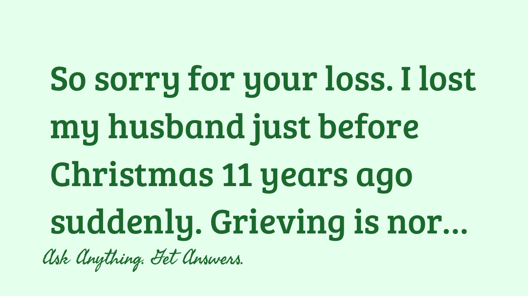 Kathy Hurry+FollowSo sorry for your loss. I lost my husband just before Christmas 11 years ago suddenly. Grieving is normal. You can’t hold your feelings in. It’s something that you have to go through. Everyone grieves differently. The first anniversary of my husband’s death, my best friend through a pajama party for me and a couple friends and family members. She made lasagna and someone brought drinks an dessert. It was nice out, so we went in the back yard and hit golf balls into the woods in his honor ( we both played, but I was a rookie) My daughters and grandchildren let off balloons out in the country with messages on them. Stick with family and friends, and let them help, or just be there. Your mom will always be there with you. I don’t know how I would have done without them all. And God. 🥰🙏🏻🙏🏻🙏🏻🙏🏻🙏🏻293Share