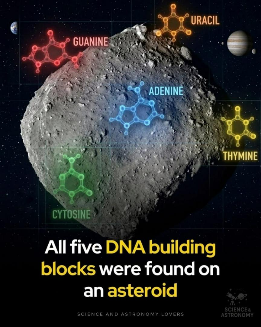 🚨 BREAKING: Scientists have uncovered something extraordinary in space… Material brought back from the asteroid Ryugu has revealed a complete set of the five nucleobases that form the foundation of life — the same molecules that make up DNA and RNA. 🧬 Using samples collected by Hayabusa2, researchers analyzed just a few grams of asteroid material and found adenine, guanine, cytosine, thymine, and uracil — all together in one place. This is the first time scientists have identified a full, balanced set of these essential components on a single celestial body. This discovery strengthens the idea that the ingredients for life may not have originated only on Earth. Instead, they could have been delivered here billions of years ago by asteroids and meteorites, carrying complex organic chemistry across space. 📚 Reference: Oba, Y., et al. (2026). A complete set of canonical nucleobases in the carbonaceous asteroid (162173) Ryugu. Nature Astronomy.