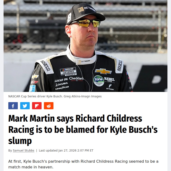 Victor Mathews+FollowIs RCR Holding Rowdy Back?Mark Martin just dropped some real talk on Kyle Busch’s struggles at RCR. After a hot start, Rowdy’s now stuck in a 93-race winless drought and missed the playoffs two years running. Martin says it’s not all on Kyle—RCR’s performance just isn’t there, and even a wheelman like Busch can’t drag a slow car to the front. Can a new crew chief in 2026 turn things around? #Sports #Racing #NASCAR00Share