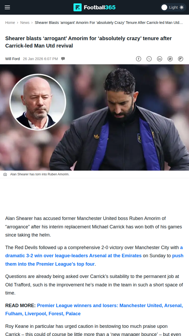 Allison Travis+FollowCarrick’s Red Devils Stun ArsenalWow, what a turnaround at Old Trafford! Since Carrick took the reins, the Red Devils have bagged back-to-back wins, including a thrilling 3-2 over Arsenal at the Emirates. Shearer’s not holding back, calling Amorim’s stubborn tactics “arrogant” and “crazy” after refusing to ditch his 3-4-3. Now, with the team clicking in a 4-2-3-1, fans are buzzing: is Carrick the real deal or just riding the new manager bounce? #Sports #Soccer #ManUtd00Share