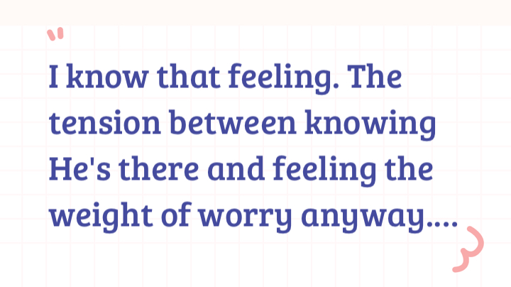 I know that feeling. The tension between knowing He's there and feeling the weight of worry anyway. You feel His hand on your shoulder. You know He's watching over her. That's not small—that's the anchor. But knowing doesn't always quiet the what-ifs. Faith doesn't erase the human part of us that loves so deeply it can't help but fear losing. Worry isn't a lack of trust. Sometimes it's just love with its sleeves rolled up, pacing the floor because it can't do anything else. But here's what I hold onto when the worry won't settle: He's not annoyed by it. He doesn't expect you to be a stone statue of faith. He sees you—the knowing and the worrying. And He stays. His hand is on your shoulder. He's watching over her. Those two truths don't cancel the worry—but they hold you while you worry. And that's enough for today. Praying for peace that doesn't make sense. And for the both of you to feel how close He really is. 🙏
