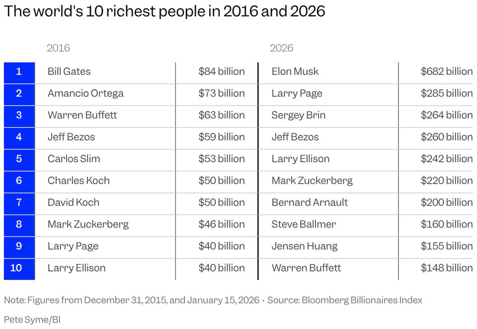 Danielle Anderson+Follow2016 Trend: How the Rich Got Super-RichRemember 2016, when catching Pokémon was the big thing? Well, since then, the world’s richest folks have gone from ‘crazy rich’ to ‘are you kidding me?’ rich. The top 10 now have nearly $2.6 trillion, up from $559 billion. Tech moguls like Musk and Zuckerberg zoomed up the list, while old-school billionaires like Gates and Buffett dropped down—mostly because they gave away billions. Moral of the story: tech stocks can be a wild ride, but giving back is still cool. #Business #Market #2016Trend10Share