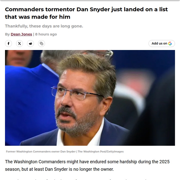 andersonkaren+FollowDan Snyder: Commanders’ Dark Cloud Ranked #2Long-suffering Commanders fans, it’s official—Dan Snyder just landed at #2 on the all-time worst owners list, only behind Donald Sterling. After years of chaos, scandals, and that infamous disconnect with legends and fans, the Snyder era is finally in the rearview. Sure, the 2025 season was rough, but with Josh Harris at the helm and big plans for the RFK site, there’s real hope. Anyone else feel like the real win was just getting rid of the tormentor? #Sports #Commanders #DanSnyder00Share