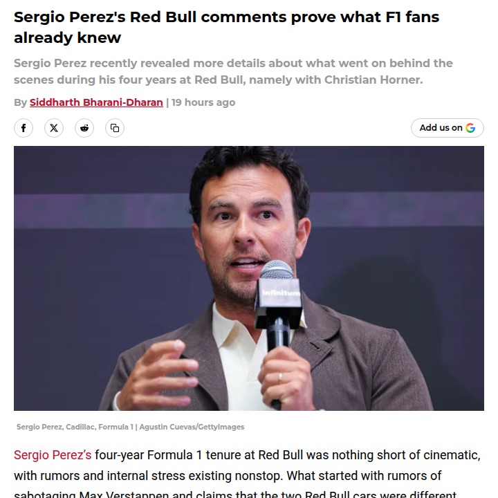 Karla Young+FollowCheco’s Red Bull Exit: Toxic Culture ExposedSergio “Checo” Perez’s recent comments about his final Red Bull years confirm what many F1 fans suspected: the team’s revolving door for the #2 seat was as ruthless as ever. From Max’s “chosen one” status to Horner’s cold responses about replacements, Checo’s inside look highlights just how cutthroat things got. With Horner and Marko gone, will Red Bull finally treat its drivers fairly? Time will tell, but Checo’s move to Cadillac might be the fresh start he deserves. #Sports #Racing #F100Share