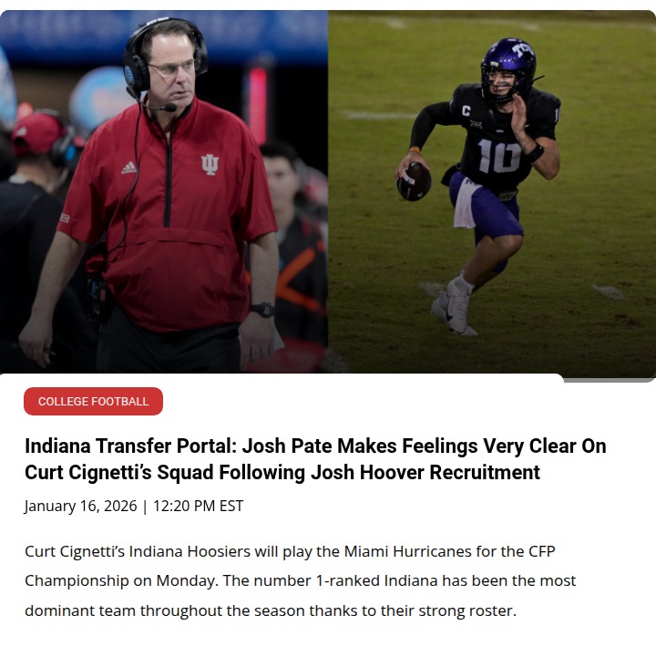 Jay Williams+FollowIndiana’s transfer portal moves shake up college footballIndiana’s football program is making serious waves this season—not just on the field, but in the transfer portal too. With Curt Cignetti at the helm, the Hoosiers have landed some top-tier talent, including quarterback Josh Hoover and wide receiver Nick Marsh, boosting them to #2 in the On3 portal rankings. Their run to the CFP Championship has only made Indiana more attractive to recruits, and the extended transfer window means more big names could join soon. Cignetti’s relentless drive and recruiting savvy are changing the game. What do you think—can Indiana’s new roster keep them on top next season? #Sports #Football #IndianaHoosiers00Share