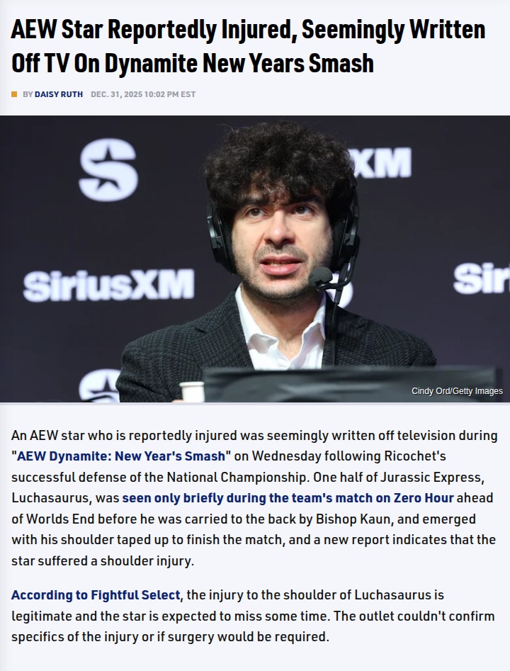 reneewang+FollowJurassic Express Shock: Luchasaurus OutTough break for Jurassic Express fans—Luchasaurus is reportedly dealing with a legit shoulder injury after that brutal ringside attack by Toa Liona and Bishop Kaun on Dynamite: New Year's Smash. He tried to tough it out with his arm taped, but after Liona smashed his shoulder with the barricade, it looks like he’s written off TV for now. No word yet on surgery, but the tag scene just got shaken up big time. Thoughts on how this impacts Jack Perry’s solo run? #Sports #Wrestling #AEWDynamite10Share