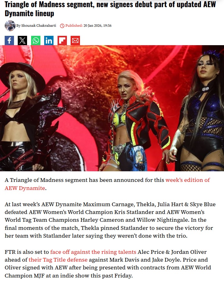 Kayla Mcconnell+FollowTriangle of Madness Heats Up AEW DynamiteThe Triangle of Madness trio—Thekla, Julia Hart, and Skye Blue—stirred up the AEW women’s division by pinning Statlander last week, and it looks like the rivalry is just getting started! Plus, FTR faces off against newly signed upstarts Alec Price & Jordan Oliver before their big Tag Title defense. Who else is hyped to see how these new signings shake up the tag scene? #Sports #Wrestling #AEWDynamite40Share