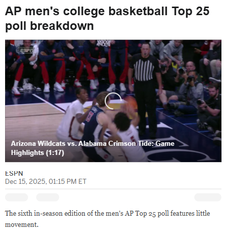 GalacticGiraffe+FollowArizona Makes AP Poll History—Can They Keep It Up?Wildcats fans, how about this: Arizona just became the first D-I squad ever to snag five wins over ranked teams in their first nine games! That 96-75 statement over Bama cements their No. 1 spot, but with rivals like the Blue Devils and Wolverines hot on their heels, can the Cats keep this historic run going? Who’s your pick to shake up the Top 10 next week? Let’s hear your takes! #Sports #ArizonaWildcats #APTop2500Share