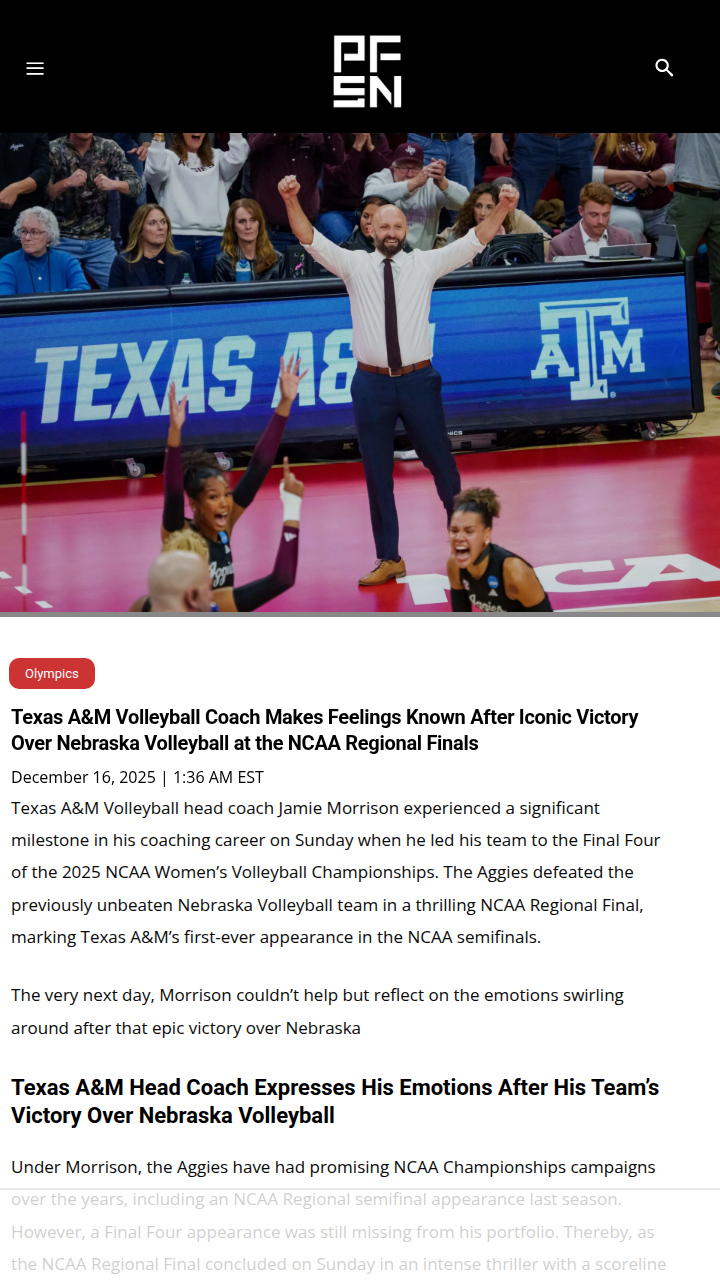 andersonkaren+FollowTexas A&M stuns Nebraska in volleyball classicTexas A&M just pulled off a volleyball upset for the ages, knocking out undefeated Nebraska in a nail-biting 3-2 finish to reach their first-ever NCAA Final Four. Coach Jamie Morrison was visibly emotional, sharing how much this win means to him and the team—especially after years of near-misses. Now, the Aggies are gearing up to face Pittsburgh, with a shot at the national title on the line. Nebraska’s incredible 33-1 season ends here, but what a run. How do you think Texas A&M will handle the pressure in the semifinals? #Sports #Aggies #NCAAVolleyball00Share