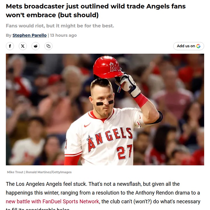 Tammy Sellers+FollowWould You Trade the Millville Meteor?Angels fans, how wild is this? SNY’s Dan Graca just floated the idea of sending the Millville Meteor, Mike Trout, to the Mets. Sure, it sounds crazy—Trout is the face of the Halos—but with his contract weighing the team down and his production dipping, maybe it’s time to think about a rebuild. Mets need a star, Angels need flexibility. Would you pull the trigger, or is this a non-starter? #Sports #Baseball #Angels00Share
