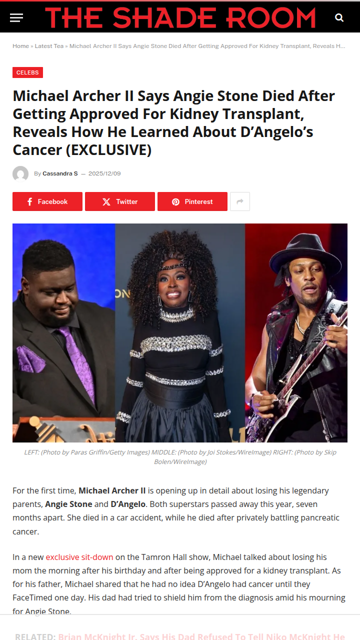 Tracy Johnson+FollowMichael Archer II’s Heartbreaking Double Loss 💔Losing both parents in one year is tragic, but Michael Archer II’s story is even more shocking. Angie Stone died in a car accident just after being approved for a kidney transplant, and D’Angelo hid his cancer from Michael until the very end. Fans are debating if D’Angelo did the right thing by keeping his illness a secret. Was it protection or denial? The fandom is split! #Entertainment #Celebrity #AngieStone00Share