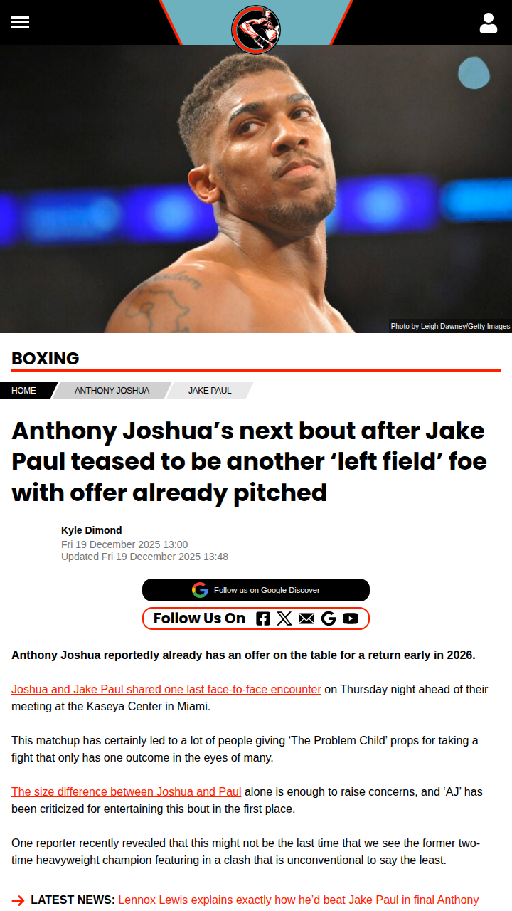 Stacie Lee+FollowAJ’s Next Move After Jake Paul: Who’s Left Field?AJ vs The Problem Child is almost here, but the real buzz is about what’s next for Anthony Joshua. Word is, if ‘AJ’ gets past Jake Paul, he’s got a wild, unexpected opponent lined up—think outside the usual heavyweight suspects. Ariel Helwani teased a February 2026 fight, with names like Rico Verhoeven floating around. Is this the right path for Joshua before a potential Fury showdown? Sound off below! #Sports #Wrestling #AnthonyJoshua20Share