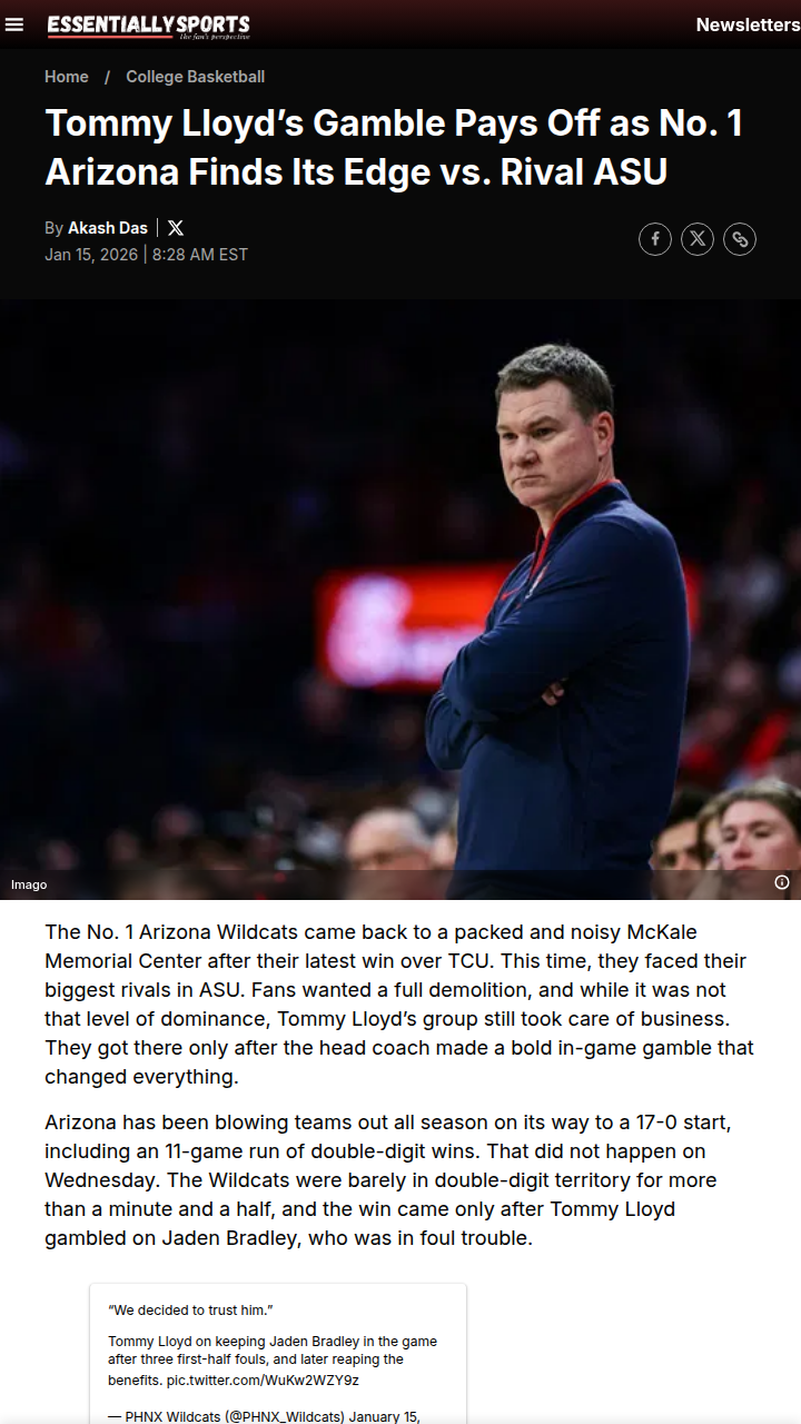 Brian Gaines+FollowArizona’s gutsy call seals win over ASUTommy Lloyd’s bold decision to keep Jaden Bradley on the court—despite foul trouble—made all the difference as Arizona edged out rival ASU in a nail-biter at McKale Center. Bradley’s clutch mid-range jumper with 27 seconds left put the game out of reach, keeping the Wildcats’ undefeated streak alive at 17-0. Even as Arizona dominated the paint, ASU’s hot three-point shooting kept things tense. With every team gunning for the No. 1 spot, Arizona’s resilience is being tested nightly. What do you think: Should coaches risk star players in foul trouble, or play it safe? #Sports #Basketball #ArizonaWildcats00Share