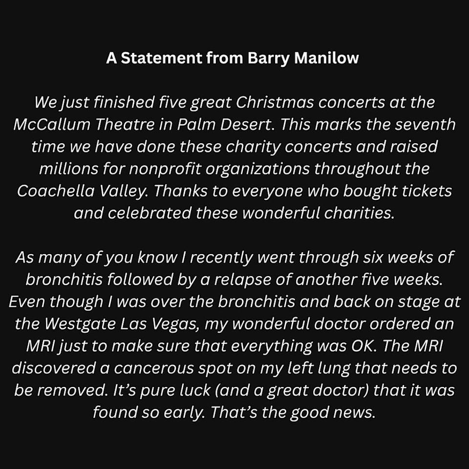 Joseph Bradley+FollowBarry Manilow Shares Cancer UpdateBarry Manilow just dropped some major news—he’s been diagnosed with lung cancer, but thanks to a lucky MRI, doctors caught it super early. He’s heading into surgery (no chemo or radiation needed!) and plans to be back on stage for Valentine’s weekend in Vegas. January shows are rescheduled, but your tickets still work. Wishing Barry a speedy recovery and lots of chicken soup! #Health #BodyHealth #BarryManilow20Share