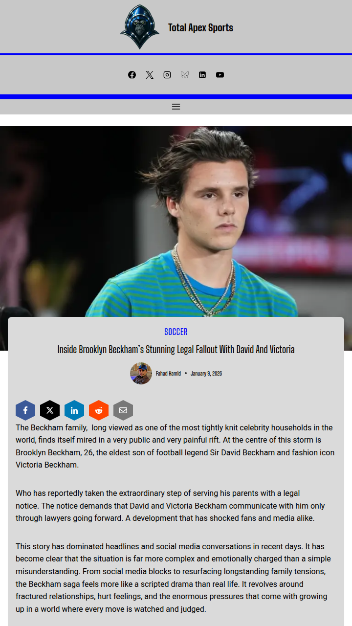 rogerschristine+FollowBeckham Family Rift: Brooklyn Blocks GoldenballsWow, never thought we'd see Goldenballs himself—Sir David Beckham—on the receiving end of a legal notice from his own son! Brooklyn Beckham has reportedly told his famous parents to talk to him only through lawyers, and even blocked them on social media after Victoria 'liked' one of his posts. This family feud is getting more intense than any Man United vs. Real Madrid rivalry. Can the Beckhams find a way back, or is this the ultimate red card? #Sports #Soccer #BeckhamFamily00Share