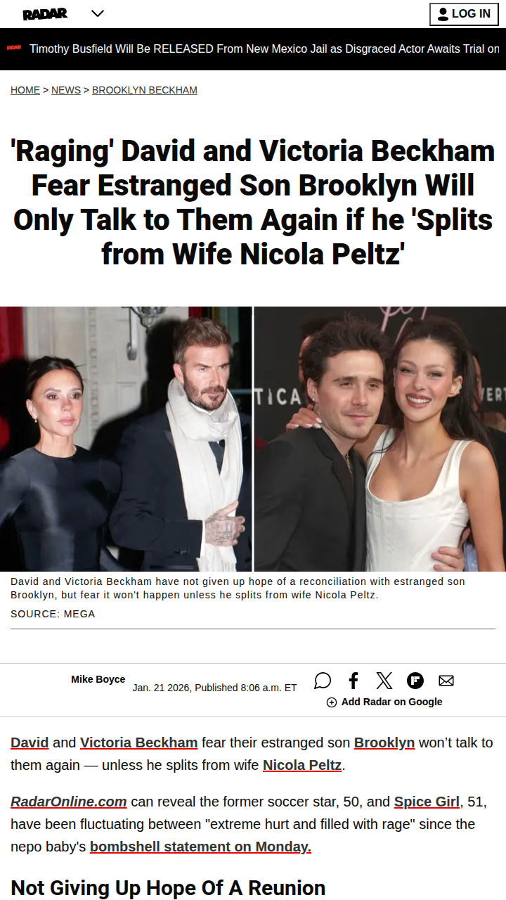Tracy Johnson+FollowBeckham Family Rift: Brooklyn Drama! 😱Can you believe the Beckhams are still on the outs with Brooklyn? The latest tea is that David and Victoria think their son will only reconnect if he and Nicola Peltz split! The wedding dance drama is wild—Victoria’s moves apparently embarrassed Brooklyn and Nicola, and now memes are everywhere. Some say Nicola never wanted the dance at all. This feud is messier than ever, and fans are totally divided over who’s to blame! #Entertainment #Celebrity #BeckhamFamily00Share
