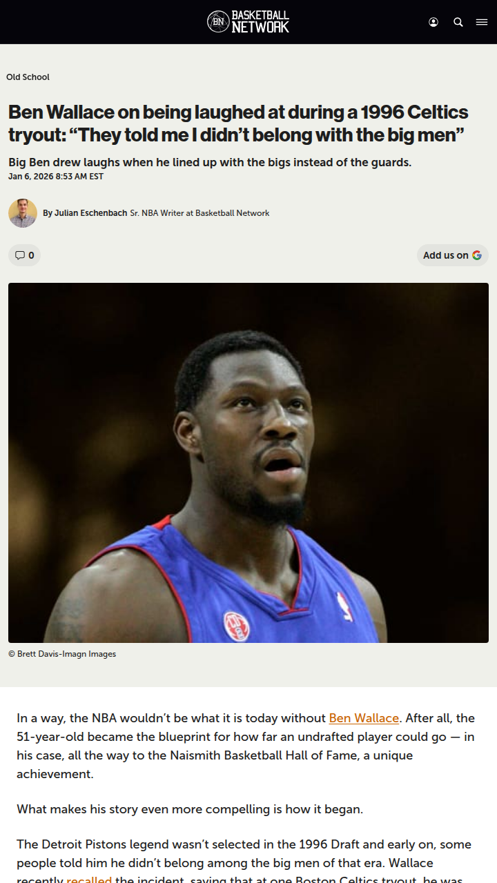 Nicole Obrien+FollowBig Ben’s Celtics Snub: Too Small for the Paint?Can you believe Ben Wallace was laughed out of a Celtics tryout in '96 for wanting to play center? The coaches thought at 6'9" he was way too small for the big man role. Fast forward, and Big Ben became a Hall of Famer and a Pistons legend, proving everyone wrong. Just goes to show, never count out the underdog—especially when he’s got a chip on his shoulder! #Sports #Basketball #BenWallace00Share