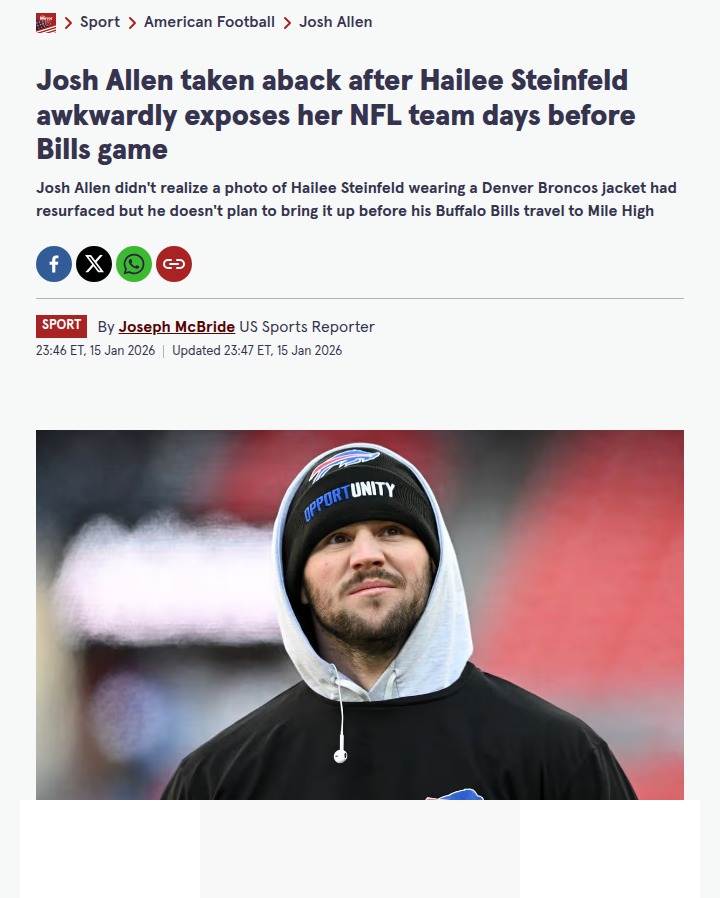 Leah Gonzales+FollowBills QB Josh Allen reacts to viral Broncos photoJosh Allen had the best reaction when an old photo of his wife, Hailee Steinfeld, wearing a Denver Broncos jacket resurfaced just days before the Bills face the Broncos in the playoffs. Even with three injuries, Allen is suiting up for Buffalo, and he’s not letting a throwback Super Bowl 50 pic rattle him. He laughed it off, saying he had no idea the photo was making the rounds and joked that Steinfeld was probably paid to attend. It’s clear their support for each other goes way beyond football. Would you care if your partner rooted for your rival team years ago? #Entertainment #Celebrity #BillsMafia40Share