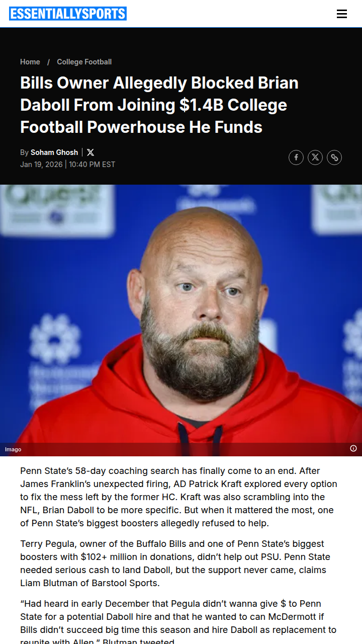 John Camacho+FollowDid Pegula Block Daboll’s PSU Move for Bills?Bills Mafia and Nittany Lion fans, what do you make of this? Rumor has it that Terry Pegula, the Bills’ big boss and PSU’s top booster, allegedly held back on funding Penn State’s push for Brian Daboll. The timing is wild—McDermott’s out, and Daboll’s name is heating up in Buffalo again. Did Pegula really pick Josh Allen’s future over his alma mater’s? Let’s hear your takes! #Sports #Football #BillsMafia00Share