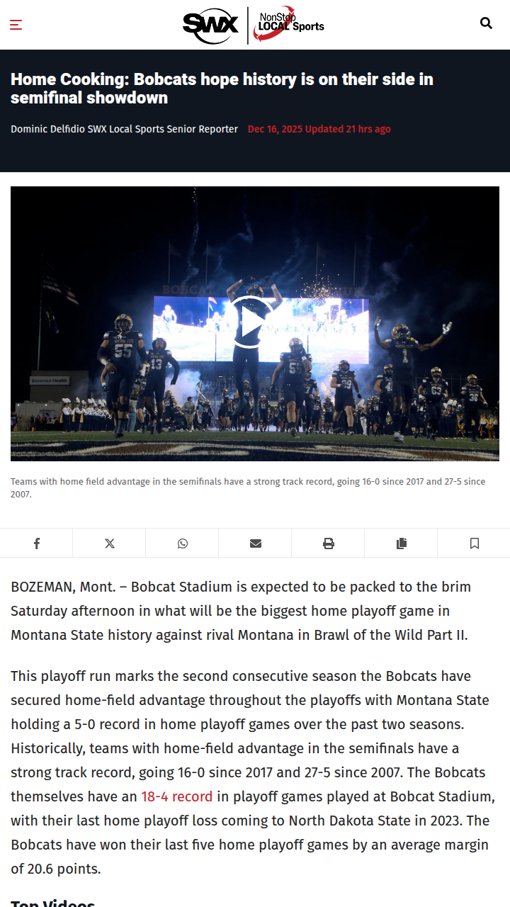 jharvey+FollowBobcat Stadium’s playoff magic: Can it last?Montana State’s home playoff streak is turning Bobcat Stadium into a fortress—undefeated in their last five home playoff games, with an average win margin of over 20 points! Saturday’s Brawl of the Wild Part II against Montana is set to be the biggest home playoff in school history, and the energy in Bozeman is electric. Players say the home crowd gives them a real edge, and the stats back it up: teams with home-field advantage in the semifinals have gone 16-0 since 2017. Do you think the Bobcats’ home-field magic will hold up? #Sports #MontanaState #Bobcats00Share