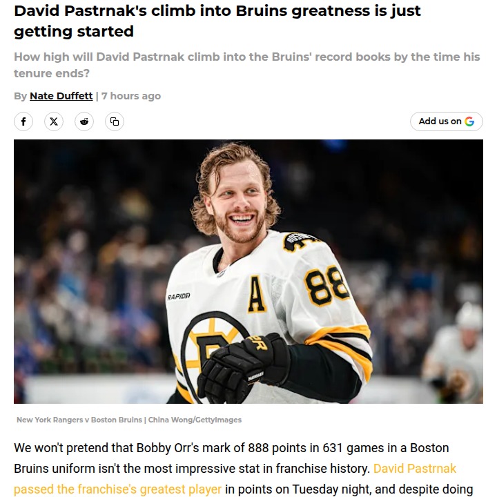 Molly Tucker+FollowPastrnak’s record chase electrifies Bruins fansDavid Pastrnak just passed Bobby Orr on the Bruins’ all-time points list—a milestone that’s got Boston buzzing. Even though it took him more games, climbing past a legend like Orr is no small feat. Now sitting at seventh, Pastrnak is only nine points away from moving up again, and with his scoring touch, he could soon catch up to Marchand, Esposito, and maybe even Bergeron. If he keeps up this pace, could we see him challenge Ray Bourque’s top spot in the coming years? Bruins fans, how high do you think Pastrnak can climb in the franchise history books? #Sports #IceHockey #Bruins00Share