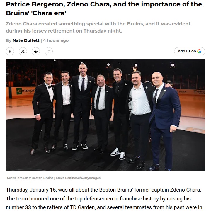 stacy28+FollowHow Chara’s legacy still shapes the BruinsZdeno Chara’s number 33 now hangs in the rafters, but his impact on the Bruins is everywhere you look—from the way Brad Marchand leads to how young stars like Pastrnak and McAvoy carry themselves. Patrice Bergeron, always humble, made it clear: this is the Chara Era, and its culture still defines Boston hockey. It’s wild to think how one captain’s influence has rippled through generations of players. What’s your favorite memory from the Chara years, and how do you see his legacy living on in today’s team? #Sports #IceHockey #Bruins10Share
