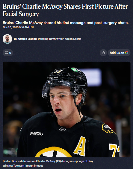 Jason Dawson+FollowBruins fans rally for McAvoy after surgeryCharlie McAvoy’s first family photo post-surgery has Bruins fans feeling all the emotions this Thanksgiving. After taking a puck to the face and landing on injured reserve, McAvoy shared a heartfelt message about gratitude, family, and the support he’s received. While there’s no clear timeline for his return, the Bruins are holding strong in the Atlantic Division, and the community is sending him positive vibes for a speedy recovery. How do you think the team will hold up until he’s back on the ice? Let’s hear your thoughts on Boston’s playoff hopes and McAvoy’s road ahead! #Sports #IceHockey #Bruins20Share