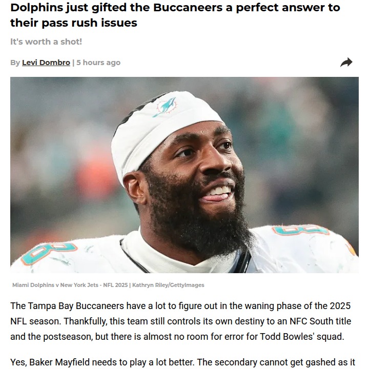 Christopher Hughes+FollowCould Matt Judon spark the Bucs’ playoff push?Tampa Bay’s pass rush has hit a wall lately, but the Dolphins just released veteran edge rusher Matt Judon—and he might be exactly what the Bucs need. With only two players above four sacks and just eight total in the last six games, the defense is desperate for a spark. Judon isn’t the force he once was, but he’s proven and affordable. Imagine him joining a playoff-bound squad, bringing fresh energy to a unit that’s been struggling. Would you take a chance on Judon to boost the Bucs’ postseason hopes? Let’s hear your thoughts! #Sports #Football #Buccaneers01Share