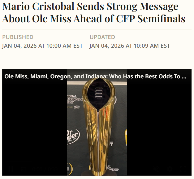 John Camacho+FollowCristobal Calls Ole Miss ‘Toughest Test’ YetCoach Cristobal just dropped some serious respect on the Rebels, calling Ole Miss the best team the Canes have faced all year—even after Miami’s epic defensive showings against Texas A&M and Ohio State. With Trinidad Chambliss leading a high-flying Ole Miss offense, this CFP semifinal is shaping up to be a classic. Is Cristobal playing mind games, or just keeping it real? Either way, bulletin board material for sure! #Sports #Football #CFBPlayoff00Share