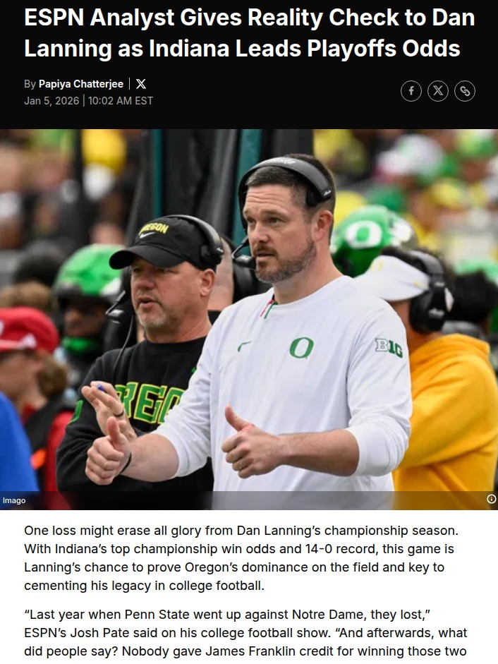 Amy Williams+FollowLanning Faces Hoosiers: Ducks’ Defining MomentHoosier Nation is riding high, but this is Dan Lanning’s shot to rewrite the Ducks’ playoff story. ESPN’s Josh Pate dropped a reality check: if Oregon falls to undefeated Indiana, Lanning’s earlier wins will be forgotten. The Hoosiers are favored, and the Ducks are battling roster hits from the transfer portal. Can Lanning shake off the October loss and finally deliver that statement win? All eyes on this semifinal—legacy on the line! #Sports #Football #CFBPlayoff00Share