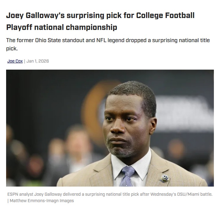 John Camacho+FollowGalloway Picks Miami Over Buckeyes for CFPBuckeye legend Joey Galloway just shocked the fanbase by picking the Hurricanes to win it all after Miami stunned his alma mater, Ohio State, in the CFP quarters. Galloway pointed to Carson Beck’s clutch, turnover-free play as the X-factor. Miami’s third-down efficiency exposed a rare Buckeye weakness, and Galloway says that’s enough to make the ‘Canes his new favorite. Is he onto something, or just salty about OSU’s collapse? #Sports #Football #CFBPlayoff00Share