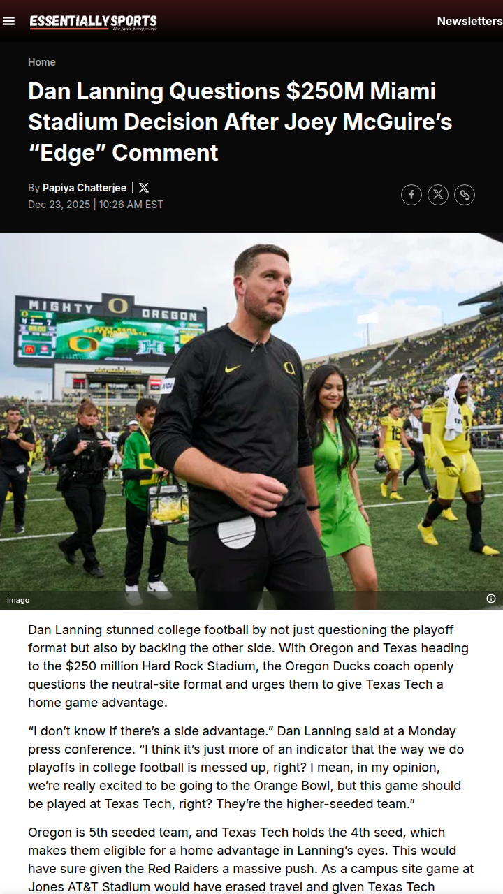 glen25+FollowLanning: Ducks-Red Raiders Deserve True Home EdgeCoach Dan Lanning is stirring the pot again, folks! He’s openly questioning why the Oregon Ducks and Texas Tech Red Raiders are squaring off at a $250M neutral site in Miami instead of giving the higher-seeded Red Raiders a real home-field advantage at Jones AT&T Stadium. Lanning argues that the current playoff format is broken, robbing Texas Tech of their crowd’s energy and travel benefits. Even Red Raiders’ Joey McGuire gave props to Lanning’s coaching ‘edge,’ but this playoff setup? Still a head-scratcher for many fans. #Sports #Football #CFBPlayoff00Share