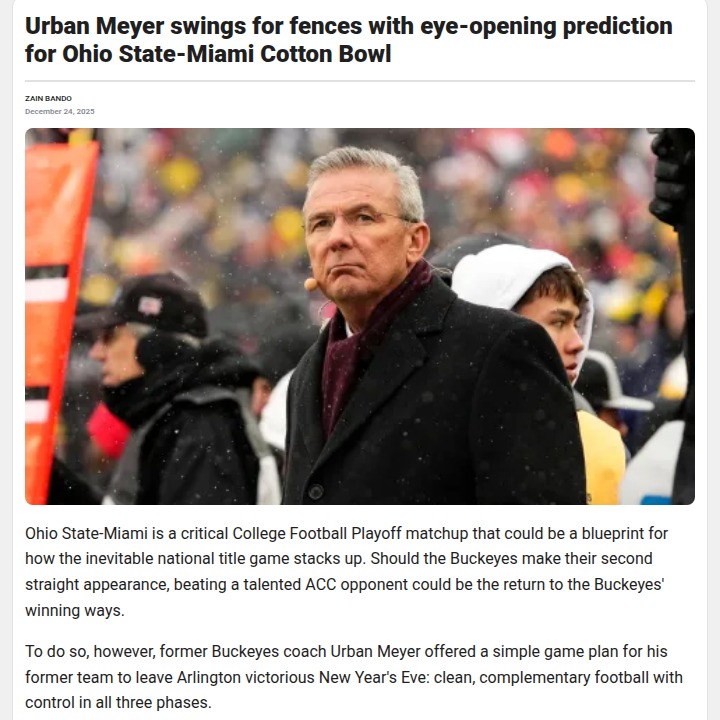 Amy Williams+FollowUrban Meyer Doubts Miami Can Score on OSUUrban Meyer just dropped a bold take on the Buckeyes-Hurricanes Cotton Bowl clash! The former OSU coach says if Julian Sayin and Jeremiah Smith get rolling, Miami’s offense won’t keep up against the nation’s top D. Meyer predicts a low-scoring game, but thinks the Buckeyes only need two TDs to punch their ticket to the title game. Can the U’s defense flip the script, or will the Scarlet and Gray bounce back big? #Sports #Football #CFBPlayoff00Share