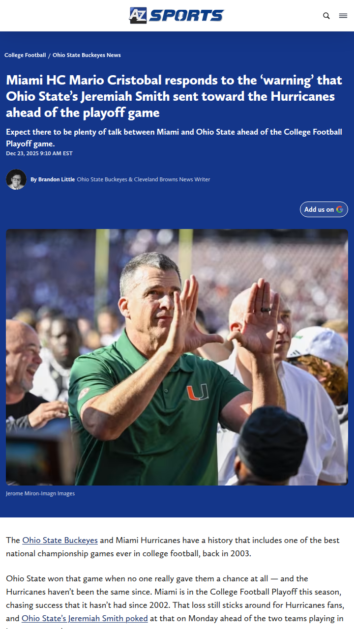 Michael Pitts+FollowCristobal Fires Back at Buckeye HypeThe old wounds from the 2003 title game are still fresh, and now Jeremiah Smith is stirring the pot before Miami and Ohio State clash again. The Buckeyes’ star wideout threw some shade, promising fireworks on New Year’s Eve. But Coach Cristobal kept it classy, saying the Canes let their play do the talking. Can Miami finally flip the script, or will the Buckeyes’ trash talk become prophecy? #Sports #Football #CFBPlayoff00Share
