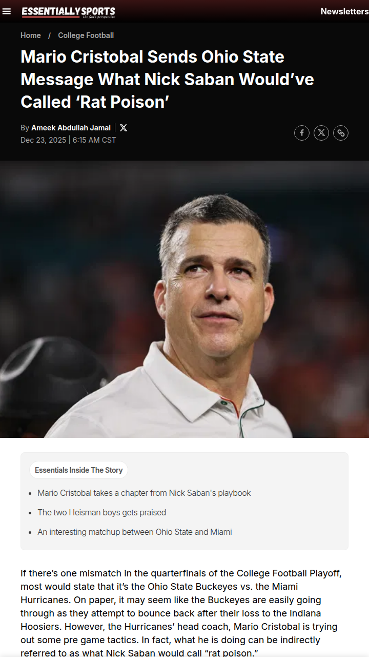 Jay Williams+FollowCristobal’s ‘Rat Poison’ Warning for BuckeyesMario Cristobal is playing mind games ahead of the CFP quarterfinal, channeling Nick Saban’s famous ‘rat poison’ line to warn the Buckeyes about getting too comfortable. While he’s heaping praise on King Day’s offense—especially future NFL star Jeremiah Smith and the ice-cold Julian Sayin—fans know this is classic coach speak. Can Miami’s D-line led by Rueben Bain Jr. actually rattle the Buckeyes, or is this just more playoff psych-out? #Sports #Football #CFBPlayoff40Share