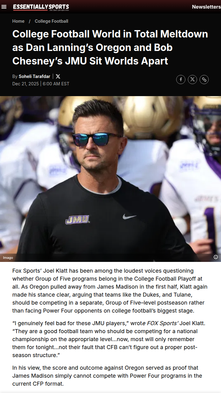John Camacho+FollowJMU vs Oregon: CFP Underdog Story Turns SourDukes fans, what a wild ride! JMU crashed the CFP party after an epic Sun Belt run, but Dan Lanning’s Ducks showed why Autzen is a different beast. The talent gap was obvious, and even with elite stats, the Dukes couldn’t hang with Oregon’s firepower. Analysts are roasting the CFP committee for the matchup—was this a G5 experiment gone wrong? Should the committee rethink the playoff structure after this blowout? #Sports #Football #CFBPlayoff00Share