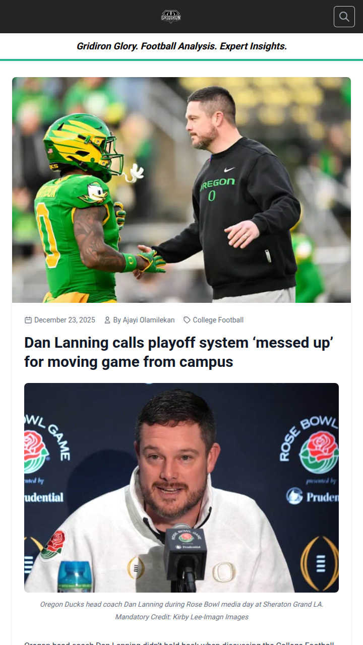 glen25+FollowLanning Slams CFB Playoff Home Field RulesCoach Lanning didn’t mince words after the Ducks’ big win—he thinks the College Football Playoff is seriously flawed. Instead of Oregon facing Texas Tech at a neutral site, Lanning says the Red Raiders should host as the higher seed. He’s pushing for a system like the NFL, where top teams get home field advantage and games happen weekly. Do you agree with Coach, or is the current setup fair? #Sports #Football #CFBPlayoff00Share