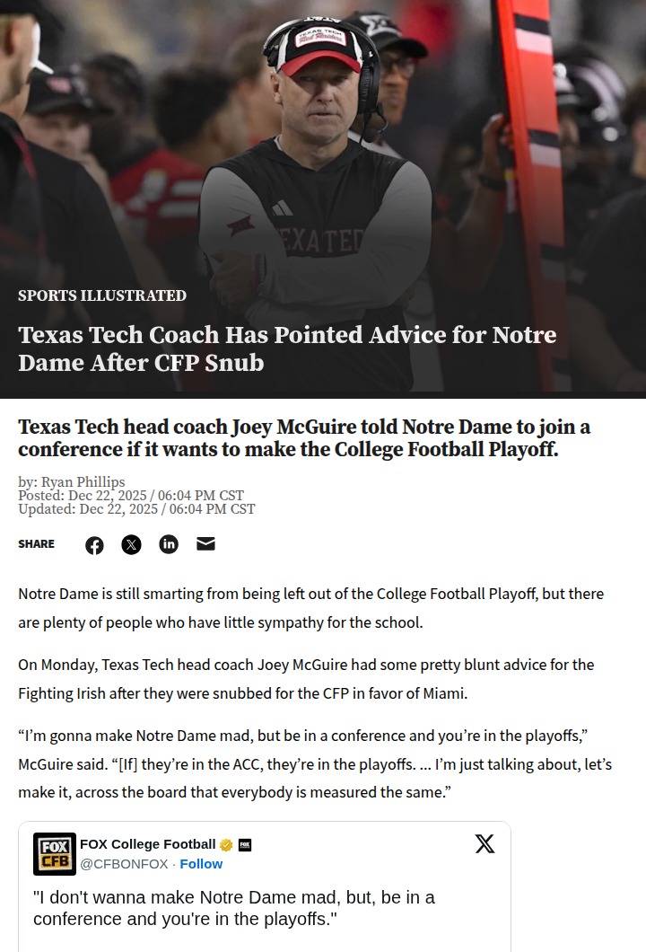 Amy Williams+FollowMcGuire Calls Out Irish Over CFP SnubRed Raider boss Joey McGuire didn’t hold back after Notre Dame’s latest College Football Playoff snub, telling the Irish to join a conference if they want in. With Texas Tech rolling to a Big 12 title and a playoff spot, McGuire’s take echoes what a lot of fans have been saying for years: independence might be tradition, but it’s costing the Irish when it matters most. Thoughts on whether the Irish should finally join a league? #Sports #Football #CFBPlayoff00Share