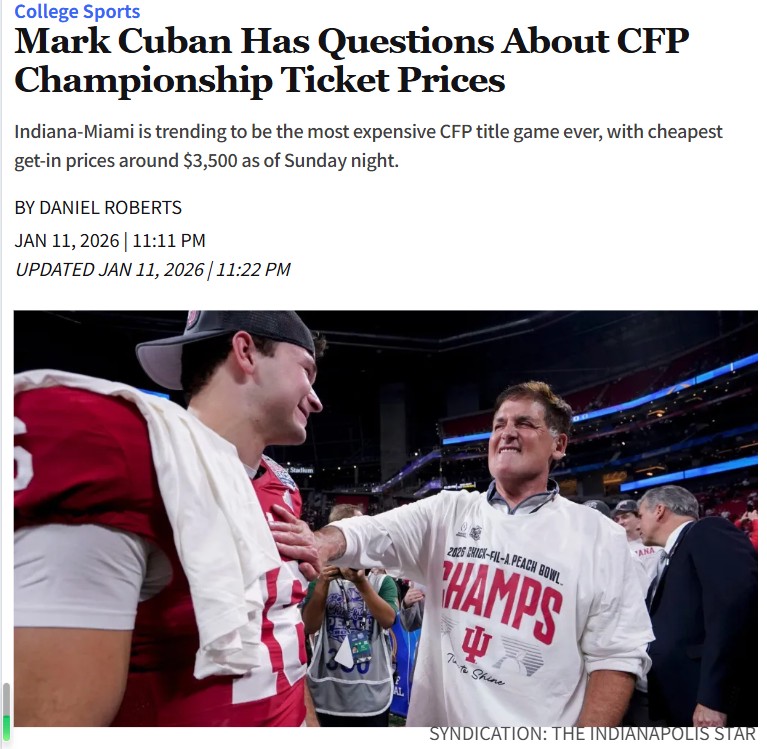 Aaron Taylor+FollowHoosier Nation Reacts: CFP Ticket Price MadnessHoosier fans, are you seeing these prices? Mark Cuban, the ultimate IU booster, just called out the insane ticket surge for Indiana vs. Miami in the CFP Championship. With the Hoosiers making history and the Canes playing at home, it’s a perfect storm. Cuban’s even crowdsourcing advice for the best way to score tickets. Will prices drop, or is this a Miami home-field lockout? Let’s hear your strategies and predictions! #Sports #Football #CFPChampionship00Share
