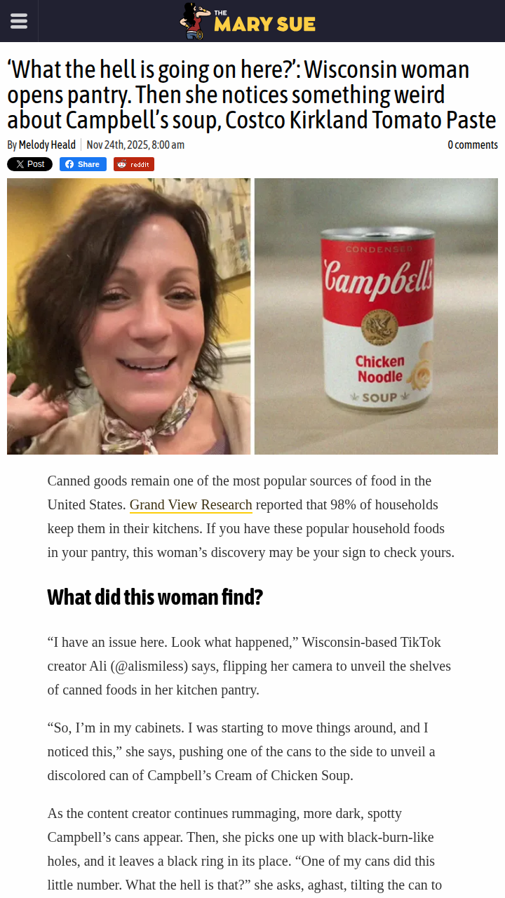 Christine Cobb+FollowWhy are Campbell’s soup cans leaking?Finding leaky, discolored Campbell’s soup and Kirkland tomato paste cans in a brand-new pantry is raising eyebrows in Wisconsin—and across the country. These cans weren’t expired, yet some had black spots, holes, and even left stains on the shelves. The CDC warns that damaged or leaking cans could mean botulism risk, even if the best-by date is years away. Turns out, others have had similar issues with different brands and temperature-controlled pantries. Have you checked your canned goods lately? Let’s talk: is this a fluke, a storage problem, or something bigger? #Entertainment #TVSeries #CampbellsSoup10Share