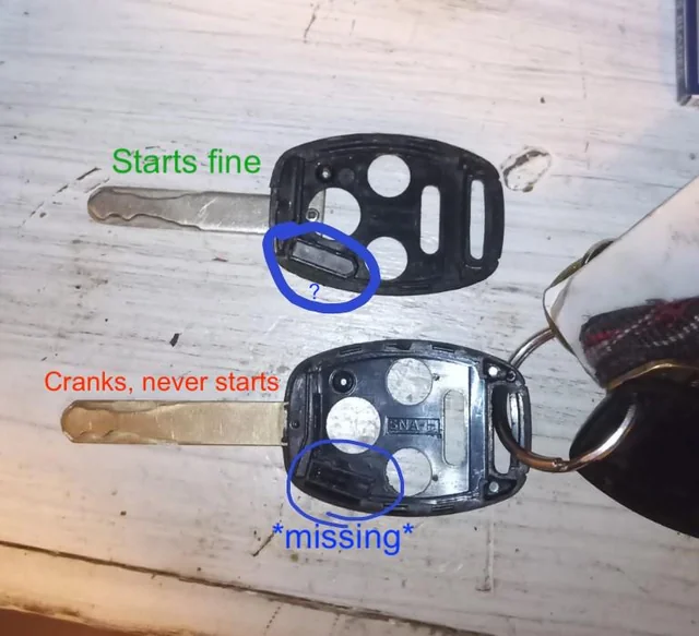 schmidtgeorge+FollowTiny clear chip fell out of my key fob. Now my 2006 CRV won't start. What is this thing?I dropped the main key to our 2006 Honda CRV and a tiny, clear piece popped out and is lost. The car cranks perfectly fine but won't catch. I know the rest of the key fob circuitry is okay, and the battery isn't even required to start the car. I tested it by holding the spare key's broken plastic shell—which still has that tiny part—next to the ignition with the damaged key inserted, and boom, it starts right up. What exactly is this essential little component? Is it some kind of radio transmitter, or just the security chip for the immobilizer system? I need to know what I actually need to replace. #MechanicAdvice #CarHacks #Immobilizer #KeyFobRepair #Cars #Honda 00Share