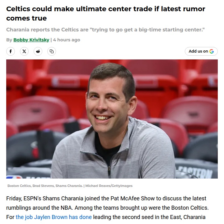 guerrajohn+FollowCeltics Eye Big Man Upgrade at Trade DeadlineShams just dropped a bomb on the Pat McAfee Show: the Celtics are in the market for a true starting center before the deadline. With Jaylen “JB” Brown playing at an MVP level and Tatum grinding through rehab, Boston’s already a top contender. But adding a guy like Zubac or Jaren Jackson Jr. could be the missing piece for Banner 18. Should Brad Stevens go all-in or trust the current squad? Let’s hear your takes! #Sports #Basketball #CelticsNation00Share