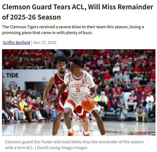 GalacticGiraffe+FollowClemson hoops faces tough loss as Foster sidelinedLosing Zac Foster for the season is a huge blow for Clemson basketball, especially after he brought so much energy and highlight plays off the bench. The freshman guard’s ACL tear means the Tigers will have to shuffle their rotation, leaning more on Ace Buckner and Butta Johnson to step up. Foster was making a real impact, and it’s tough to see such a promising start cut short. How do you think this will affect Clemson’s momentum and depth for the rest of the season? Who do you see stepping up in Foster’s absence? #Sports #ClemsonBasketball #ZacFoster00Share